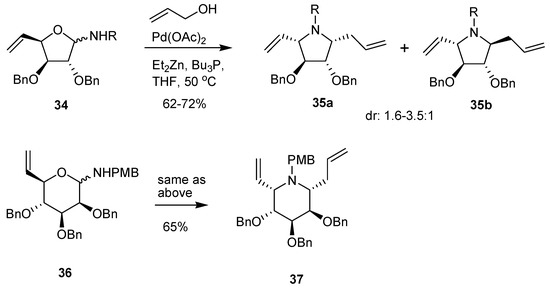 In very recent work, Rao et al. reported an interesting Pd-mediated double allylation process in which the C-N bond is created in the same step as the C-C bond [74]. This procedure requires a substrate (furanosyl- or pyranosylamine) carrying a vinyl group at C-4 or C-5, respectively. Thus, for example, glycosylamine 34 was submitted to reaction with allyl alcohol in the presence of diethylzinc, tributylphosphine, and catalytic Pd(II) acetate, in THF at 50 °C for 24 h, to give directly the cyclized 1-C-allyl, 4-C-vinyl pyrrolidine 35, with low stereoselectivity, however (Scheme 14).