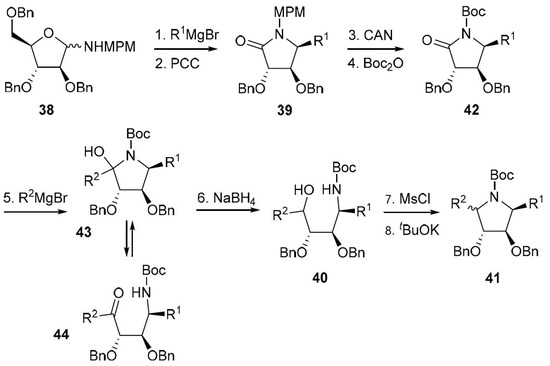 Finally, a modified version of the Nicotra’s procedure was reported in the 1990s by Yoda et al. [75,76]. In this work, the product resulting from the addition of a Grignard reagent (R1 = C4H9, C9H19, Bn) to a glycosylamine such as 38 was submitted to an oxidative chain shortening leading to a carboxylic acid derivative which underwent spontaneous cyclization to a lactam (e.g., 39) (Scheme 15). The interest of this procedure is the possibility to use the lactam for a second alkylation step, by way of the addition of an organometallic reagent (e.g., R2 = C4H9, C9H19, Bn), reduction of the resulting hemiaminal to give 40, and cyclization by an SN2 process.