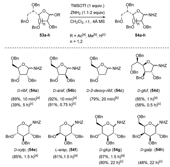 Carbohydrates derived N-benzyloxycarbonyl-N-glycosides are typically protected by O-benzyl substituents (Scheme 17). Their preparation proceeds through dropwise addition of trimethylsilyl trifluoromethanesulfonate (TMSOTf) to a suspension of benzyl carbamate (1.1–2 equiv.) and related glycosyl acetates 53 in CH2Cl2 at room temperature [89,90,91,92]. Since benzyl carbamate is a weak nucleophile and glycosylamines are unstable under aqueous conditions, addition of 4 Å molecular-sieves (MS) is essential to prevent the formation of hydrolyzed products [89].