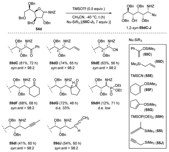 Studies on the addition of silicon-based nucleophiles to semicyclic N,O-acetals possessing an exocyclic nitrogen atom protected by an alkoxycarbonyl group were pioneered by Kobayashi on simple substrates [87,88], and subsequently applied to the sugar series [89].