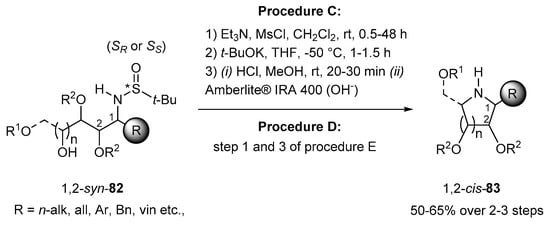 Due to the usual difficulty in separating the two diastereomers of compounds 47, the open-chain products were often subjected to numerous synthetic sequences. In general, reductive N-dehydroxylation using a Zn–Cu couple [82] was achieved in good yield (ca. 90%). Then, the resulting benzylamino-1-deoxyalditol derivatives 47 were transformed into pyrrolidine and piperidine iminosugars following standard activation of the free hydroxyl group and cyclization. MsCl in the presence of Et3N was used for the synthesis of N-benzyl-N-glycosides. For the cyclization of compounds 47f–h which do not cyclize under the present conditions, a catalytic amount of tetramethylethylenediamine (TMEDA) was added as a promoter [83], followed by heating the crude product in MeCN at 85 °C.