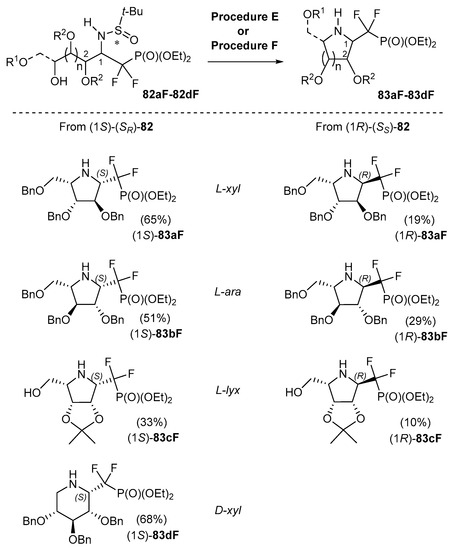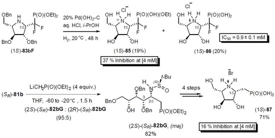 - Cocaud, C.; Nicolas, C.; Poisson, T.; Pannecoucke, X.; Legault, C.Y.; Martin, O.R. Tunable Approach for the Stereoselective Synthesis of 1-C-Diethylphosphono(difluoromethyl) Iminosugars as Glycosyl Phosphate Mimics. J. Org. Chem. 2017, 82, 2753–2763. [Google Scholar] [CrossRef] [PubMed]
