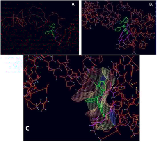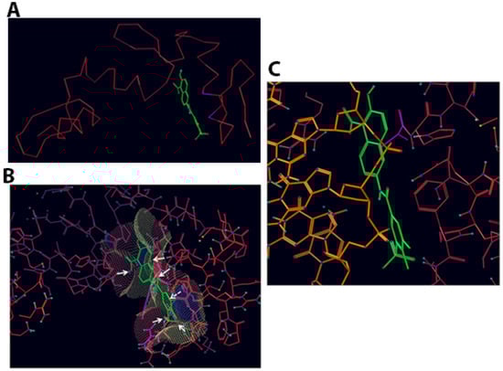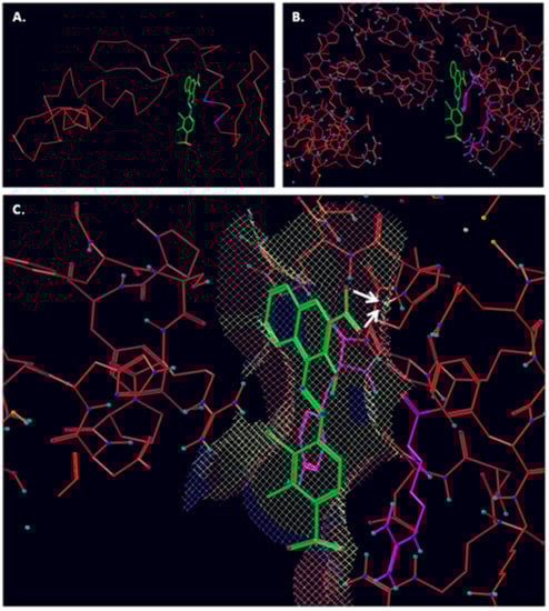 NSC16087 docked into Model II binding site. In (A) alpha carbon trace, in (B) complete model and in (C) NSC16087 docked into Model binding site with the accessible surface mesh. Hydrogen bonds to His 48 are shown with white arrows.