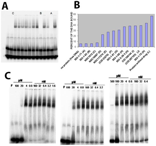 Next, we tested the effect of candidate inhibitors (see Table 1) on the DNA binding affinity of Vezf1. Vezf1 protein at 640 nM concentration was incubated with 500 μM of potential inhibitors for 10 min. All the 12 compounds tested are soluble in water and/or DMSO. 25 nM labeled DNA was added to the reaction and binding assays were done as described above (see Figure 5A). The bound and the free DNA fractions were quantified and plotted (see Figure 5B). Various compounds had varying effect on the DNA binding ability of Vezf1. 3 of the 12 tested compounds, A, B and C, had the greatest degree of potency resulting in a near complete loss of DNA binding by Vezf1. The percent bound DNA is also shown in Table 1.