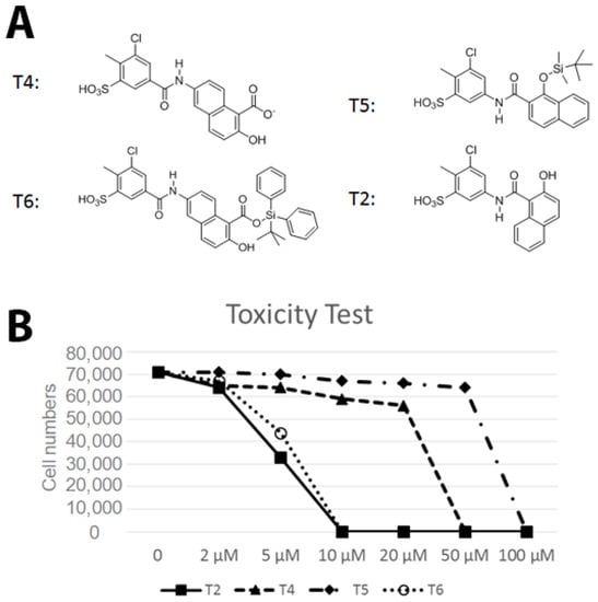 Following the biochemical tests, we wanted to test the ability of these compounds to inhibit Vezf1 activity in cells. However, we first tested the cellular toxicity of some selected compounds. We tested four candidates: T4: most potent based on IC50, followed by T6 and T5. We also tested T2 as a control which has no effect in vitro on Vezf1 DNA binding but it has a similar structure to T4 (see Figure 6A). Due its critical role in endothelial development and angiogenesis, we used the mouse endothelial cell line, MSS31, for these studies. Cultured MSS31 cells were treated with increasing concentration of the four inhibitors, T4, T5, T6 and T2 for 24 h. Cells were collected and the live cell population was counted by Bio-Rad cell counter using Trypan Blue exclusion test. Live cells are impermeable to Trypan blue dye, which only stains the dead population. The Bio-Rad cell counter identifies and counts only the unstained cells. As shown in Figure 6B, exposure to T2 and T6 causes cell death at very low concentration. T4 is less toxic and can be tolerated until 50 μM. These data show that T4 can be tolerated by cells at concentrations close to its estimated IC50.