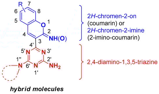 General structure of the hybrid molecules composed of 2,4-diamino-1,3,5-triazines and 2-imino-coumarins or coumarins.