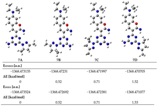 The structure 7A was proven to be the lowest energy rotameric form both in DMSO and aqueous solution, while the energy differences between 7A and rotamers 7B, 7C and 7D were very low (0.52–1.53 kcal/mol). Therefore, we determined the barriers of C3-C4′ and C6′-N1′′ bond rotations (Figure 3) and found that the barrier of C6′-N1′′ rotation was much higher (15.2 kcal/mol) than those of C3-C4′ rotation (8.5 kcal/mol). It is significantly easier to overcome the later barrier under normal conditions (14–20 kcal/mol), which suggests that the two separate pairs of rotamers (7A, 7B) and (7C, 7D) may exist in the solution at room temperature, leading to a doubling of the C2=NH proton signal.