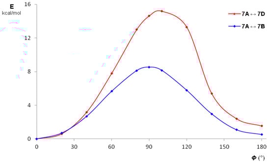Profiles of the total energy difference with respect to the 180° rotation of single bonds C3–C4′ (7A↔7B) and C6′–N1′′ (7A↔7D).