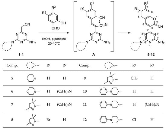 After this, the compounds bearing an active methylene group underwent a reaction with 2-hydroxybenzaldehydes in the presence of piperidine to give the desired hybrid 2-imino-2H-chromen-3-yl-1,3,5-triazine compounds 5–12 (Scheme 2). The reactions were carried out in 98% ethanol at 20–40 °C in the presence of piperidine as a basic catalyst. The best yields (49–61%) were achieved by using 2-hydroxybenzaldehyde with electron-donating substituent, which was mainly 4-(diethylamino)-2-hydroxybenzaldehyde.