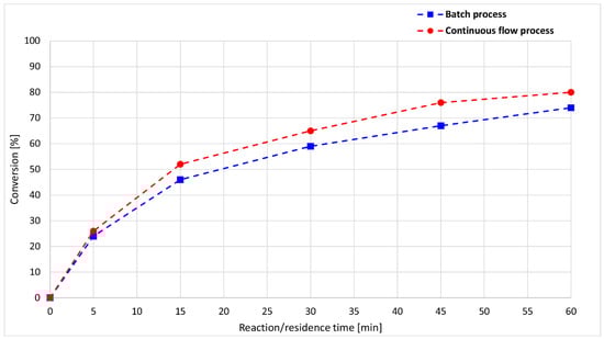 Comparing the conversions of the flow and batch processes, the two plots show a similar shape; however, after a reaction time of 15 min, the batch conversions were 5–10% lower than the flow results (Figure 4).