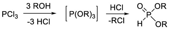 The industrial synthesis of dialkyl H-phosphonates is comprised of the reaction of phosphorus trichloride with alcohols (Scheme 1) [40,41,42,43,44,45]. Although this transformation is convenient, efficient and may be scaled up, it requires a solvent, and the liberating HCl decreases the atom efficiency. It is also a disadvantage that the synthesis of derivatives with different alkyl groups is not possible.