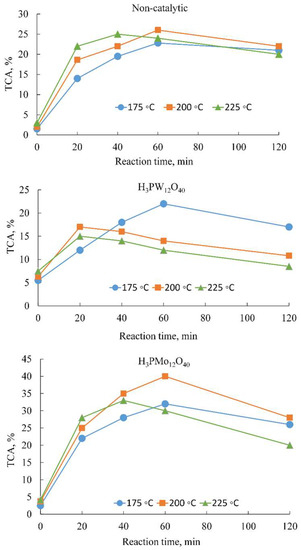 Effect of temperature and reaction time on the total carboxylic acids (TCA) yield. In the catalytic experiments, the lignin:catalyst ratio was 2:1 (w/w).