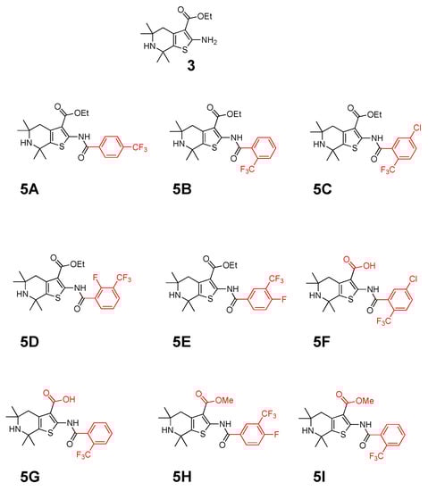 Briefly, the 2,2,6,6-tetramethylpiperidine ketone (1, 1 equivalent) was mixed with 2-cyanoacetate esters (2, 1 equivalent) and elemental sulfur (1 equivalent) in the presence of diethylamine (3 equivalents) in ethanol (ETOH) at 60 °C for 17 h. The crude was precipitated by adding water and filtered to provide the desired known 2-aminothiophene intermediate (3) [12]. The latter was reacted with 4-trifluomethy benzoyl chloride in the presence of diisopropylethylamine in dry dichloromethane at 0 °C for 1 h and then at room temperature for 4 h. The solvent was evaporated then the crude mixture was purified by flash-column chromatography on silica gel, using a mixture of solvent of dichloromethane: methanol (DCM: MeOH) at ratios from 100:1 to 50:1, to provide the desired ethyl 5,5,7,7-tetramethyl-2-(4-(trifluoromethyl)benzamido)-4,5,6,7-tetrahydrothieno [2,3-c]pyridine-3-carboxylate (5A) as a light brown solid. The purity of 5A was confirmed by 1H-NMR, 13C-NMR, LC/MS and melting point.
