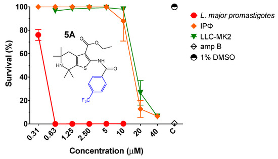 First, the efficacy of thiophene derivative 5A was evaluated against transgenic L. major promastigotes expressing firefly luciferase (L. major-luc) as previously described [16,17]. Compound 5A at a range of 0.31–10 µM was incubated with 2 × 106 L. major-luc promastigotes per mL for 72 h at 28 °C, and in vitro parasite viability (% survival) was measured by luciferase activity. Compound 5A displayed an approximate 50% effective concentration (EC50) of 0.34 µM against L. major promastigotes (Figure 3 and Table 1). Furthermore, we investigated the potential cytotoxicity of 5A by alamarBlue™ Cell Viability Assay (Thermo Fisher Scientific, Waltham, MA, USA) [18] and 5A displayed a selective index (S.I.) of 30.58 against BALB/c intraperitoneal mouse macrophages (IPФ), and 51.91 in monkey kidney cells (LLC-MK2) (Table 1).