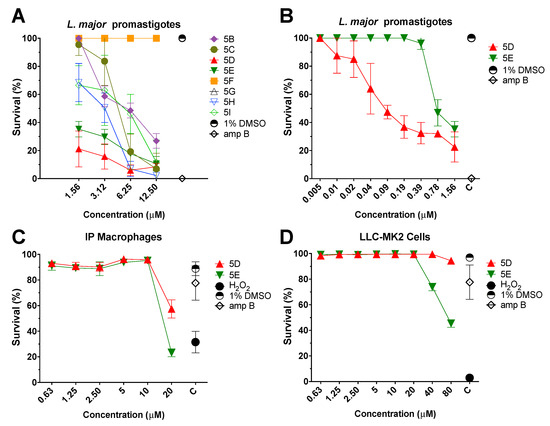 Consequently, cytotoxicity assays were performed by incubating LLC-MK2 or IPФ with compounds. First, 5D or 5E were incubated with 1 × 105 LLC-MK2/mL or 1 × 105 IPФ/mL for 72 and 48 h, respectively. Interestingly, compound 5D did not display perceptible toxicity against LLC-MK2 at concentrations up to 80 µM (Figure 4C,D). In the case of IPФ, 5D exhibited a CC50 value of 27.89 ± 3.19 µM and an excellent S.I. of 310. As 5E compound CC50 values of 80 ± 4.45 µM in LLC-MK2 cells and 16.59 ± 1.52 µM in IPФ, with S.I. values of 102.56 and 21.27, respectively. More importantly, we determined that both 5D and 5E displayed lower cytotoxicity to mammalian cells and higher parasitic activity than parent compound 5A (Table 1).