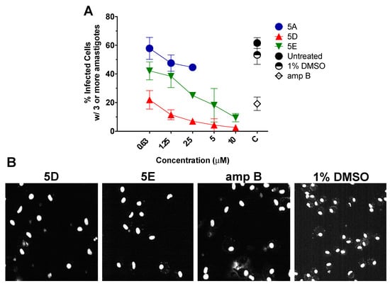 (A) High content imaging assay (HCIA) analysis of intraperitoneal mouse macrophages (IPΦ) infected with L. major-luc amastigotes, followed by treatment with 5D or 5E from 0.63 to 10 µM for 48 h. Controls included untreated, 1% DMSO, amphotericin B (amp B) at 5 µM, or parent drug 5A. Data are represented as the percentage (%) of infected IPΦ with three or more amastigotes per cell. Note: Data for 5A at concentration 5 and 10 µM were not generated because 5A was cytotoxic for IPΦ at such concentration. (B) Representative monochromatic images of infected IPΦ with L. major after 48 h treatment with 5D or 5E at 2.5 µM, amp B (5 µM), or 1% DMSO.