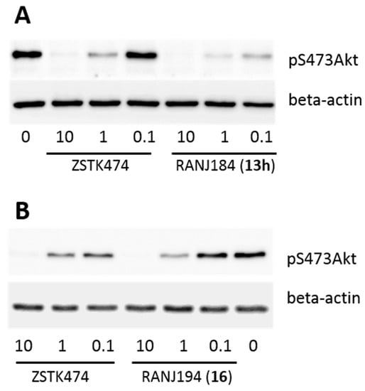 Representative western blots of S473 protein kinase B (Akt) phosphorylation in C4-2 prostate cancer cells. (A) C4-2 cells were treated with ZSTK474 or compound 13h (Scheme 4; 10, 1, or 0.1 µM each). (B) C4-2 cells were treated with ZSTK474 or compound 16 (Scheme 4; 10, 1, or 0.1 µM each). Equal loading was controlled by probing western blot for beta-actin.