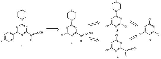 Triazines offer synthetic advantages over pyrimidines in that the addition of substituents onto its core does not produce regioisomers that have to be separated. The synthesis and characterization of trisubstituted triazines and pyrimidines remains an active area of PI3K inhibition research [38,39,40,41,42,43,44,45,46,47]. We focused most of our synthetic efforts on trisubstituted triazines (Scheme 1; 1) which contain (1) a linker group terminating in a primary alcohol which can be used as a peptide linkage point, (2) a secondary amine (largely morpholine due to its known importance [47]), and (3) a hydrogen-bonding aromatic or heteroaromatic group.