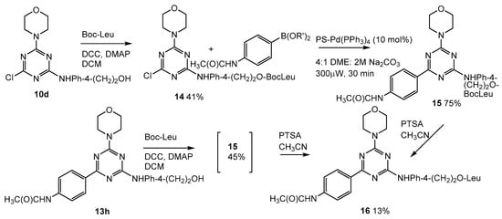 All compounds 11–13 (Scheme 3) were screened as PI3K inhibitors, and compared directly to ZSTK 474 in this assay (see Supplementary Materials for Western blots). Trisubstituted triazine (13h, Scheme 2) was our most active compound as a PI3K inhibitor (see screening discussion below); therefore, we undertook its preparation where leucine was added to the primary OH in the linker group. In our earlier work [34], we showed that a PSA-cleavable peptide (Mu-LEHSSKLQ) added to produce prostate-specific prodrugs cleaved between L and Q; thus, any peptide-linked PI3K inhibitor contains a leucine residue. Two different routes to the desired compound were explored. In one case, Boc-protected leucine was added to the primary alcohol in the linker in disubstituted triazine (10d, Scheme 4), and then, this compound (14, Scheme 4) was subjected to cross-coupling conditions to produce 15 (Scheme 4), which was immediately deprotected. In an alternate route, Boc-protected leucine was added directly to 13h (Scheme 4) to produce 15 (Scheme 4), and then, the protecting group was removed to yield 16 (Scheme 4).