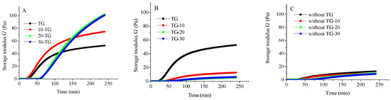 The evolution of the storage modulus as a function of time ((A) Route 1; (B) Route 2; (C) Route 3 (without mTGase)).