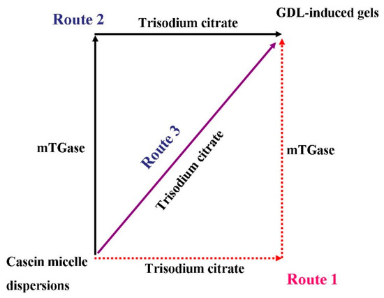In route 3, micellar casein dispersions treated with 0 mmol/L trisodium citrate, 10 mmol/L trisodium citrate, 20 mmol/L trisodium citrate, and 30 mmol/L trisodium citrate (in the absence of mTGase) were directly acidified with GDL.
