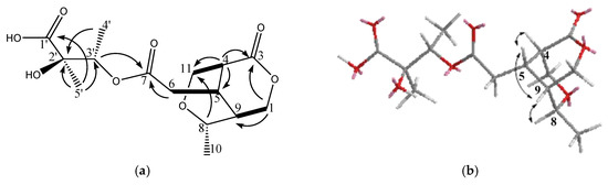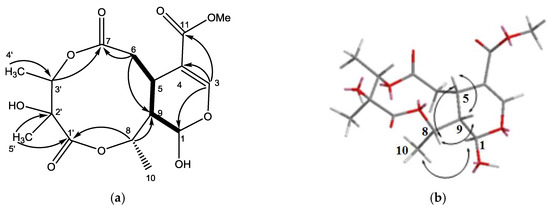 (a) The structure of metabolite 1 and selected 1H–1H COSY (▬) and HMBC (→) correlations. (b) Selective NOESY correlations of 1.