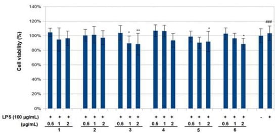 Effects of compounds 1–6 and lipopolysaccharide (LPS) on the viability of RAW 264.7 macrophages. Cells were treated with LPS for 6 h prior to treatment with indicated concentrations of compounds or LPS alone. Following a 24 h incubation period, cell viability was assessed using an MTS assay. Cell viability was calculated as the percentage of surviving cells over control cells (no compounds added). Values are presented as mean ± standard deviation of three independent experiments. ### p < 0.001 control group as compared to LPS-treated group. * p < 0.05 and ** p < 0.01 were compared with the LPS-alone group. -: cells without treatment, +: cells previously treated with LPS.