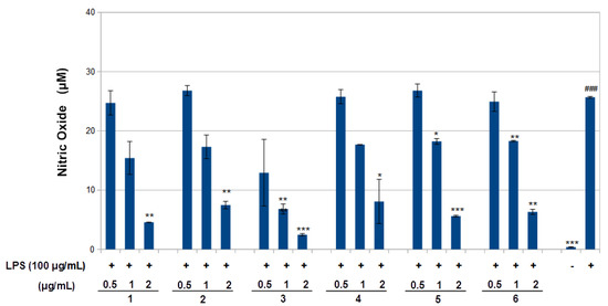 Inhibition of nitric oxide (NO) production by compounds 1–6 in LPS-stimulated RAW 264.7 macrophages. RAW 264.7 cells were stimulated by LPS (100 ng/mL) for 6 h and then treated with the indicated concentrations of compounds 1–6 for 24 h. NO was measured using Griess reagent. Values are presented as mean ± standard deviation of three independent experiments. ### p < 0.001 control group as compared to LPS-treated group. * p < 0.05, ** p < 0.01, and *** p < 0.001 were compared with the LPS-alone group. -: cells without treatment, +: cells previously treated with LPS.