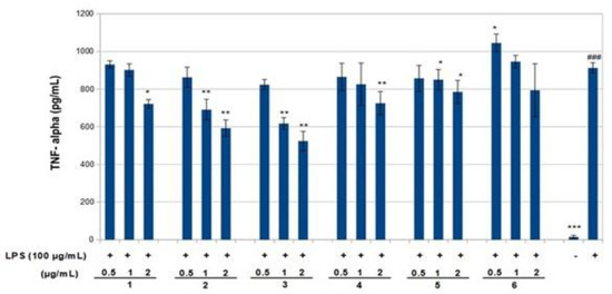 Inhibition of tumor necrosis factor-α (TNF-α) production by compounds 1–6 in LPS-stimulated RAW 264.7 macrophages. RAW 264.7 cells were stimulated by LPS (100 ng/mL) for 6 h then treated with various concentrations of compounds 1–6 for 24 h. TNF-α production was measured using the corresponding ELISA kits. Values are presented as mean ± standard deviation of three independent experiments. ### p < 0.001 control group as compared to LPS-treated group. * p < 0.05, ** p < 0.01, and *** p < 0.001 were compared with the LPS-alone group. -: cells without treatment, +: cells previously treated with LPS.
