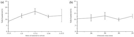 Effect of different parameters on the extraction yield of essential oils from S. sphenanthera: (a) ratio of material to solvent; (b) ultrasonic time; (c) ultrasonic temperature; (d) ultrasonic power.