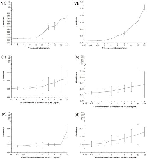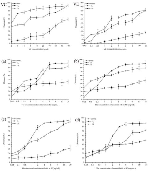 The results of free radical scavenging activities of essential oils from four species ((a) SG; (b) SR; (c) SS; (d) SP).