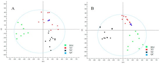 PCA score plots of plasma metabolic profiling of NC, BM, XT and QC in positive mode (A) and negative mode (B).