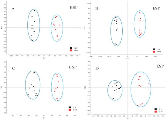 OPLS-DA score plots of urine metabolic profiling (A,B) and blood metabolic profiling (C,D) of BM and XT.