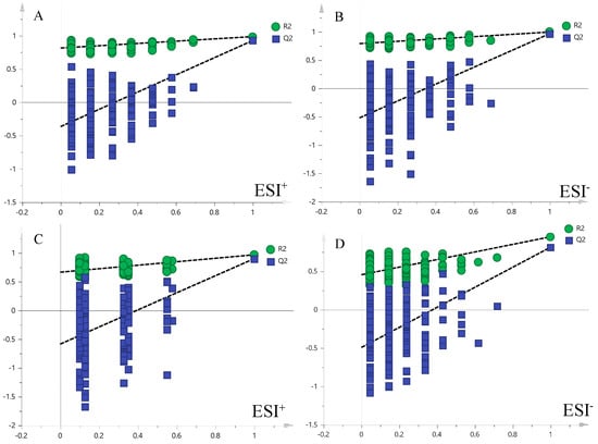 The permutations plots of the OPLS-DA models of urine (A,B) and plasma (C,D), respectively.