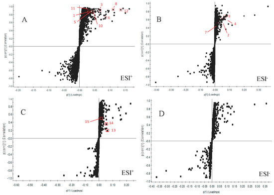OPLS-DA S-plots of urine metabolic profilings (A,B) and blood metabolic profiles (C,D) of the XT group and BM group in ESI+ and ESI−. (the numbers of potential biomarkers correspond to the list in Table 3).