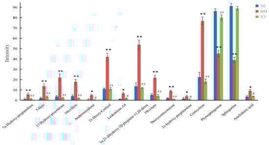 The possible molecular formula of the potential markers were calculated by high-accuracy quasi-molecular ion within mass error of 10 ppm and in order to eliminate the interference fractional isotope abundance was detected by Q/TOF-MS. There were a total of 15 potential markers identified in urine and plasma. On the one hand, ten of the putative markers were confirmed by matching their retention times and accurate mass measurements with available reference standards. In the other hand, other five putative structures of these metabolites were identified by comparing accurate molecular weight and tandem mass spectrometry data obtained in this study with the information recorded in biochemical databases (HMDB). MS/MS spectrum of the potential markers were shown in Supplementary Materials. For example, the potential markers at m/z 333.2421 contained four major fragment ions at m/z 315, 287, 285 and 269. The fragment information was found to be most similar to 17-hydroxyprogesterone. The high-abundance fragment ions at m/z 315 and 269, respectively, represent [C21H31O2]+ and [C19H25O]+. There are another two major fragment ions at m/z 287 [C21H31O]+ and m/z 285 [C21H29O]+, further indicating that this potential markers is 17-Hydroxyprogesterone. Unfortunately none of the potential markers was identified from the blood metabolic profiling in ESI− mode, so there is no legend of relevant metabolites in Figure 6D. As seen from the summary of the information of potential markers in Table 3, 7α-hydroxypregnenolone, 5-HETE (hydroxeicosatetraenoic acid), 17-hydroxyproesterone, 16(R)-HETE, androstenedione, 21-deoxycortisol, leukotriene A4, 3α,21-dihydroxy-5β-pregnane-11,20-dione, 19(S)-HETE, deoxy-corticosterone, 21-hydroxypregnenolone, cortexolone and arachidonic acid were significantly decreased in the XT group compared with those in BM group while showed no differences compared with those in NC group. On the contrary, phytosphingosine and sphinganine in the XT group were significantly increased compared with those in BM group and showed no difference compared with those in NC group. The normalized intensity of differential metabolites in different groups were shown in Figure 7.