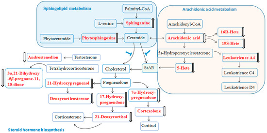 We also noted an interesting phenomenon whereby another two metabolites, phytosphin- gosine and sphinganine, were lower in the BM group compared to the NC group (P < 0.05), and returned to normal after XXT treatment. These two metabolites are involved in sphingolipid metabolism and can affect the downstream metabolite ceramide that can serve as an inhibitor of StAR expression and of the conversion of cholesterol into pregnenolone [22], which was supported by our findings.