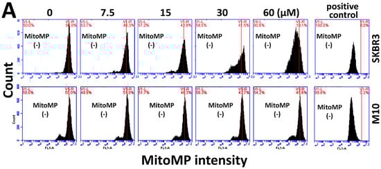 Change of MitoMP in sinularin-treated breast cancer (SKBR3) cells. (A) Representative dose response of MitoMP profiles for sinularin-treated SKBR3 cells using flow cytometry. Cells were treated with 0 (DMSO only), 7.5, 15, 30, and 60 μM of sinularin for 24 h. The left side labeled with MitoMP (−) indicates the percentage of the MitoMP-negative region in each panel. Positive control treatment is 50 μM carbonyl cyanide m-chlorophenyl hydrazone (CCCP) with 20 min incubation.