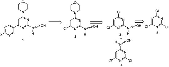 Synthesis and characterization of trisubstituted triazines and pyrimidines remains an active area of PI3K inhibition research [37,38,39,40,41,42,43,44,45,46]. Since both core structures provide inhibitors that are quite active, we decided to prepare both trisubstituted triazines and trisubstituted pyrimidines, and here we report our work on the pyrimidines (Scheme 1). Target compounds reported here contain (1) a linker group terminating in a primary alcohol which can be used as a peptide linkage point; (2) morpholine (due to its known importance in PI3K inhibition [44]); and (3) a hydrogen-bonding aromatic or heteroaromatic group.