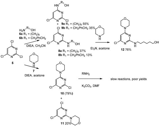 Sequential nucleophilic aromatic substitution reactions on 2,4,6-trichloropyrimidine present some challenges which are not present for the triazine core. Statistically, if one assumes all three chlorine-containing carbons are equally reactive, then the best one can hope for off the first nucleophilic addition is a 2:1 mixture of products. Separation can be effected then or sometimes others have then added a second nucleophile and separated the four products produced [46,59]. A second consideration is rate of reaction and isolated yields when one has the option of adding a primary amine or secondary amine as the first or second step in the sequence. In our hands, morpholine (7) added to trichloropyrimidine (5) much faster than the primary amines, and if we added morpholine (7) first then reactions of primary amines on a morpholine-substituted dichloropyrimidine (10 or 11) were very sluggish and hard to drive to completion. Given that, we decided to pursue adding primary amino alcohols to trichloropyrimidine first. We performed reactions using both 6-amino-1-hexanol (6a) and 4-aminomethylphenylmethanol (6b) and isolated much higher yields of products (8a/9a) from 6-amino-1-hexanol (6a) (Scheme 2). We decided to take the minor isomer (8a) on for convenience since subsequent nucleophilic additions (in our case here morpholine) to that compound can yield only one regioisomer (12) (whereas additions to 9a or 10 would be expected to yield two regioisomers). We isolated 12 in excellent yield and avoided the careful chromatographic separations needed for 811 at this disubstituted pyrimidine stage.