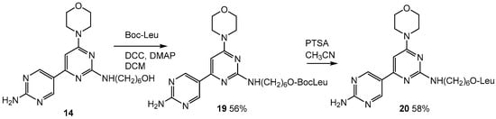 Since compound 14 was quite active as a PI3K inhibitor (see screening discussion below), we undertook its preparation where leucine was added to the primary OH in the linker group. In our earlier work [33], we demonstrated that peptide (Mu-LEHSSKLQ) in prostate-specific prodrugs is cleaved between L and Q, so the leucine residue remains attached to the PI3K inhibitor. To mimic the prodrug cleaved by PSA, Boc-protected leucine was coupled to 14 to produce 19 in good yield and then the protecting group was removed to yield 20 (Scheme 6).
