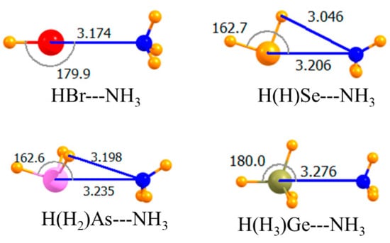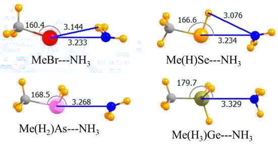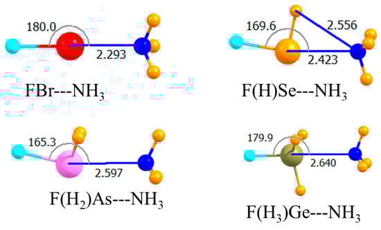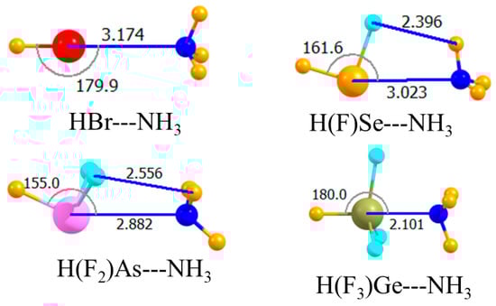These various noncovalent bond analogues of the H-bond share a number of characteristics [37,38,39,40,41,42,43,44,45,46,47,48,49,50,51,52,53,54]. For example, regardless of the particular family of atoms, as one moves down a column of the periodic table, the atom becomes progressively less electronegative and more polarizable. Both of these factors tend to amplify the σ-hole, and reinforce charge transfer from the nucleophile, and to thus strengthen the corresponding noncovalent bond. These same factors can also be intensified if electron-withdrawing substituents are added to the atom in question. Scores of previous results have accordingly demonstrated the ability of such substituents to strengthen the noncovalent bond to the approaching nucleophile. This effect is most pronounced when the substituent lies directly opposite the nucleophile, where it can better accommodate additional charge accumulation from the electron donor. Due to a strong electrostatic component in all of these bonds, they are dramatically strengthened if the Lewis acid is positively charged, with a like reinforcement upon interaction with an anion.