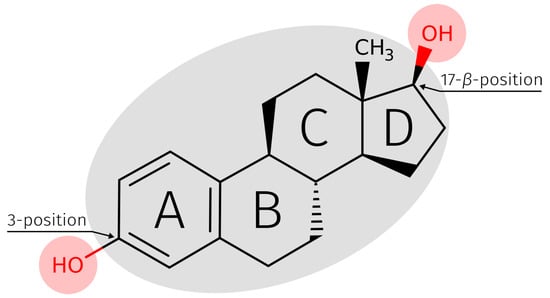 Skeletal formula of E2 with three highlighted structural features. The two red shaded circles are hydroxyl groups at 3- and 17--position and can act as donor or acceptor in H-bonds. The grey shaded area represents the hydrophobic rigid backbone. The A-ring of E2 is the aromatic ring system for the formation of possible -stacking interactions. Skeletal formula of E2 adapted from DrugBank [39]. E2, 17-estradiol.