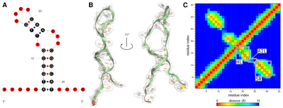 Since no experimentally determined 3D structure of the aptamer exists, it has to be modeled first. Based on the 2D representation of single stranded DNA (ssDNA) (Figure 2A), the 3D structure was generated with MMB [33] (Figure 2B and the corresponding animation is provided in Video S1), which was the starting point of the performed MD simulation. The E2-specific aptamer consists of five unbound bases AAGGG at the 5-end, four unbound bases AGTG at the 3-end, and the following secondary structure elements (SSEs): a stem region with six intramolecular base pairs, an asymmetric interior loop and a stem-loop (hairpin loop) (Figure 2A). A distance map (Figure 2C) can be used to verify whether the expected SSEs can be observed after generating the 3D model. The map shows how distant bases in 3D structure of the ssDNA are from each other. Orange areas in the highlighted SSEs in the distance map show the formed base pairs of the 3D structure and have a distance between 1.54 Å and 1.92 Å. The bases that formed the asymmetric interior loop have a distance between 13.10 Å and 15.00 Å (dark blue color in Figure 2C). The generated 3D structure with the formed SSEs was used as basis for the MD simulation.