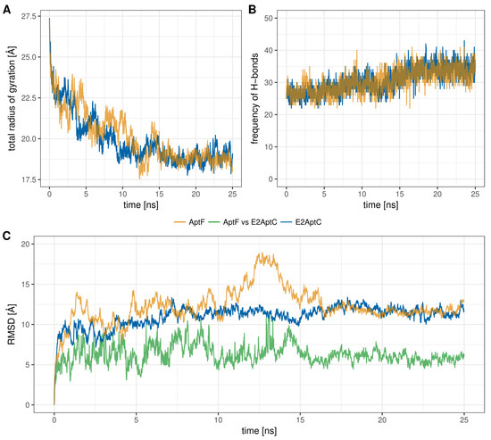 The radius of gyration () is an established measurement to identify structural stability and compactness of modeled structures [40]. The plot in Figure 3A shows the comparison of the structures AptF and E2AptC. Both structures showed stabilization after a simulation time of 15 ns. From this point on, both structures are considered at equilibrium. The average value of AptF structure is 20.10 ± 1.56 Å. In the case of AptF, these value remained virtually unchanged with an average value of 19.88 ± 1.48 Å.