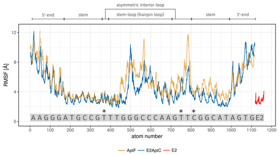 RMSF of aptamer and E2 atoms during 25 ns MD simulation. RMSF comparison between AptF (orange line) and E2AptC (blue line). E2 is a part of E2AptC MD simulation and is depicted as a red line. The various secondary structures of the E2-specific aptamer are shown above the plot and the binding bases of E2 are highlighted with the asterisk symbol (). AptF, aptamer-free; E2, 17-estradiol; E2AptC, E2-aptamer complex; RMSF, root mean square fluctuation.