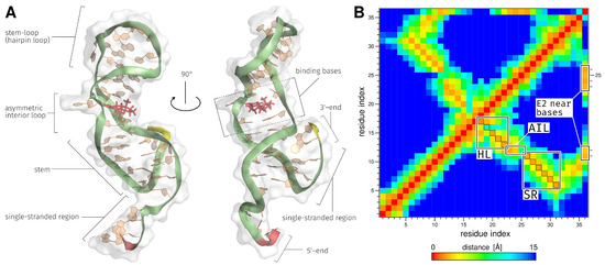 (A) Final model of the E2AptC obtained from 25 ns MD simulation, with formed SSE. The 5-end is shown in red within the structure and the 3-end in yellow. E2 is shown as stick model and in red color. For improved visibility, all water molecules and ions have been removed. (B) Distance map of the smallest distance between every pair of bases (residue index 1–35) and E2 (residue index 36) of the last time step of MD simulation. Bases that are very close to each other are displayed in red. The SSE and the E2 near bases are framed in black. Within the framed areas, the orange and cyan fields show the formed SSEs with a distance range between 1.54 Å and 10.00 Å. The bases in the AIL region have a distance between 1.92 Å and 8.46 Å. The orange fields of the E2 near bases have a distance between 1.92 Å and 2.69 Å. AIL, asymmetric interior loop; E2, 17-estradiol; E2AptC, E2-aptamer complex; HL, hairpin loop; SR, stem region; SSEs, secondary structure elements.