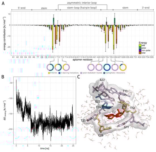 To understand aptamer-ligand association at the molecular level, it is helpful to determine the aptamer bases that interact with the ligand. The bases strongly interacting with E2 are G11, T12, T24, and C26. The total free binding energy between E2 and these four bases is in the range from −17.15 to −14.95 and contributes the majority of binding energy (Figure 6A). From an energetic point of view, these bases are the most important interaction partners of E2 and in Figure 6C it can be seen that these bases directly surround E2. The base T25 contribute a total energy value of −6.20 ± 1.79 and exhibits a higher energy than the other four. This base is also very close to E2 and binds E2 non-specifically with phosphate backbone of the aptamer (Figure 6C). T25 had a small part in the binding of E2 and was involved in 10.84% of time in binding (Table 2). Interaction analysis using the PLIP tool has shown that these four bases also play an important role in the formation of non-covalent interactions (Table 2 and Figure S1). The distribution of the interactions at the respective positions can be seen below the energy contribution plot (Figure 6A). This shows that the binding of E2 by base G11 mainly consist of hydrophobic interactions and water-mediated H-bonds. Base T12 mainly binds with hydrophobic interactions, water-mediated H-bonds, and H-bonds. Base T24 binds with -stacking interactions and base C26 with H-bonds. In addition to these four dominant bases, other bases were detected that also had non-covalent interactions with E2. These include T13, A22, G23, and T25 and their energy values are summarized in Table S1. The average binding energy also obtained from the MM/PBSA calculation of the E2AptC was −168.32 ± 0.57 and the corresponding trajectory can be seen in Figure 6B. Furthermore, the corresponding components of the average binding energy , the van der Waals energy were calculated with −145.17 ± 0.39 , electrostatic energy with −24.31 ± 0.22 , polar solvation energy , and non-polar solvation energy with −12.85 ± 0.02 . In the time range from 1 ns to approximately 6 ns, the binding energy decreases strongly from −40.09 to −210.10 (Figure 6B). A minimum binding energy between the aptamer and E2 of −238.45 was achieved at 15 ns. Figure 6C shows E2 and a small section of the aptamer structure. A total of eight bases have been identified that have formed non-covalent interactions with E2. The colors of the bases correspond to the most frequently detected specific integration types per base.