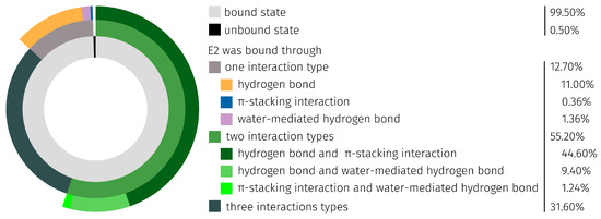 To determine which types of interaction occur most frequently and in which combination, these are divided according to their occurrence (Figure 7), but non-specific interactions were not included in the donut chart. In over 99% of the simulation time, E2 was bound by the aptamer. The ligand was bound in more than 12% by only one, in approximately 55% by two, and in over 31% by all three types of detected interactions. E2 is bound in 11% of the simulation time by a single H-bond. The combination of the interaction types H-bond and -stacking was dominant in the binding of E2 by the aptamer (over 44%). Least present were the water-meditated H-bond (1.36%), -stacking interaction (0.36%), and the combination of these (1.24%).