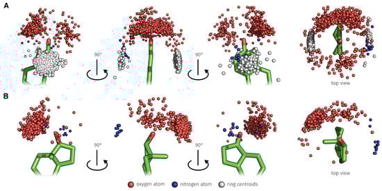 Distribution and different perspectives of the detected base interaction atoms during the 25 ns MD simulation that formed O–H⋯O (red atoms) and N–H⋯O (blue atoms) H-bonds and ring centroids representing the -stacking interaction (gray pseudo atoms). (A) The focus is on the 3-position of E2. (B) The focus is on the 17--position of E2. E2, 17-estradiol.